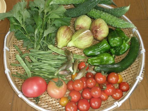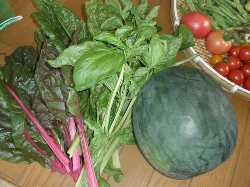 パセリ 青しそ モロッコインゲン セロリ 種が落ちて出て来た。 つるな 離れの日よけ。 小玉 スイカ 大玉トマト プリンスメロン  ミニトマト 梅の土用干し用の 籠にいっぱい。  ブラックベリー パブリカ 大きくなっていますが