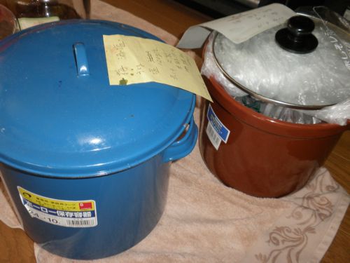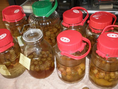 購入した梅と 姉に頂いた梅です。だいたい 氷砂糖が溶けたので 離れの台所の冷暗所に持って行きます。