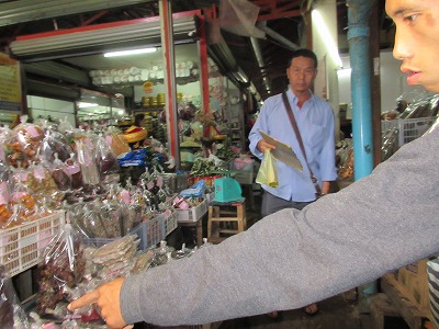 天秤棒で 担いで 野菜や ピーナッツの販売。右下の籠にピーナッツが入っています。