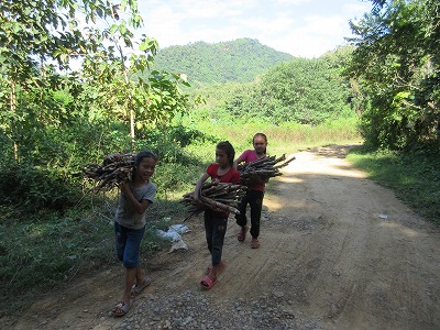 山を ほとんど 降りたところで 小学生ぐらいの女の子3人が 薪を抱えて 帰っていくのに